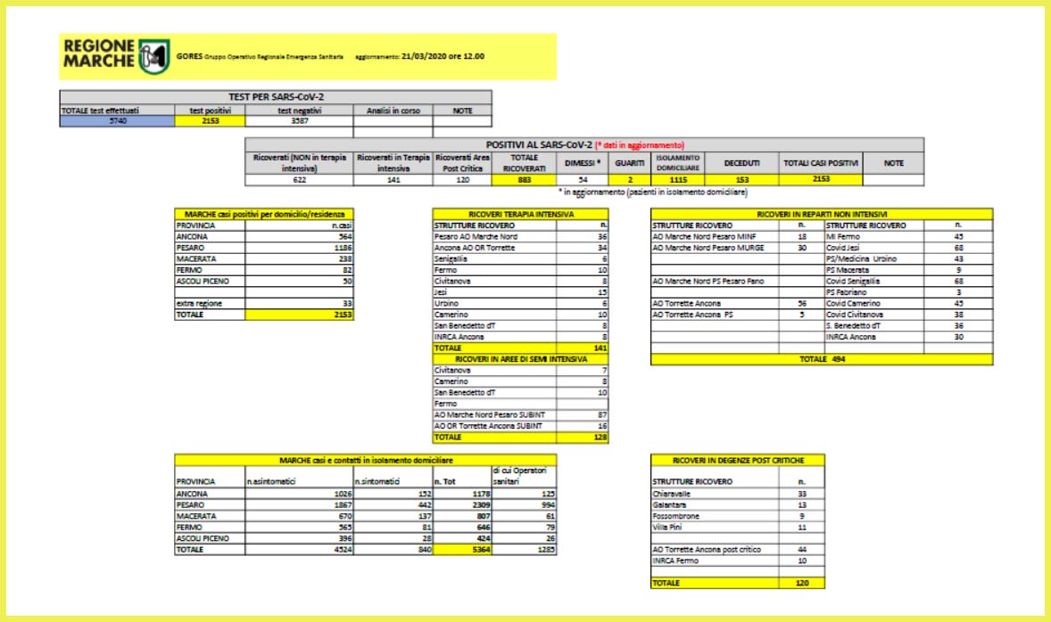 Coronavirus Marche, aggiornamento Gores delle ore 12