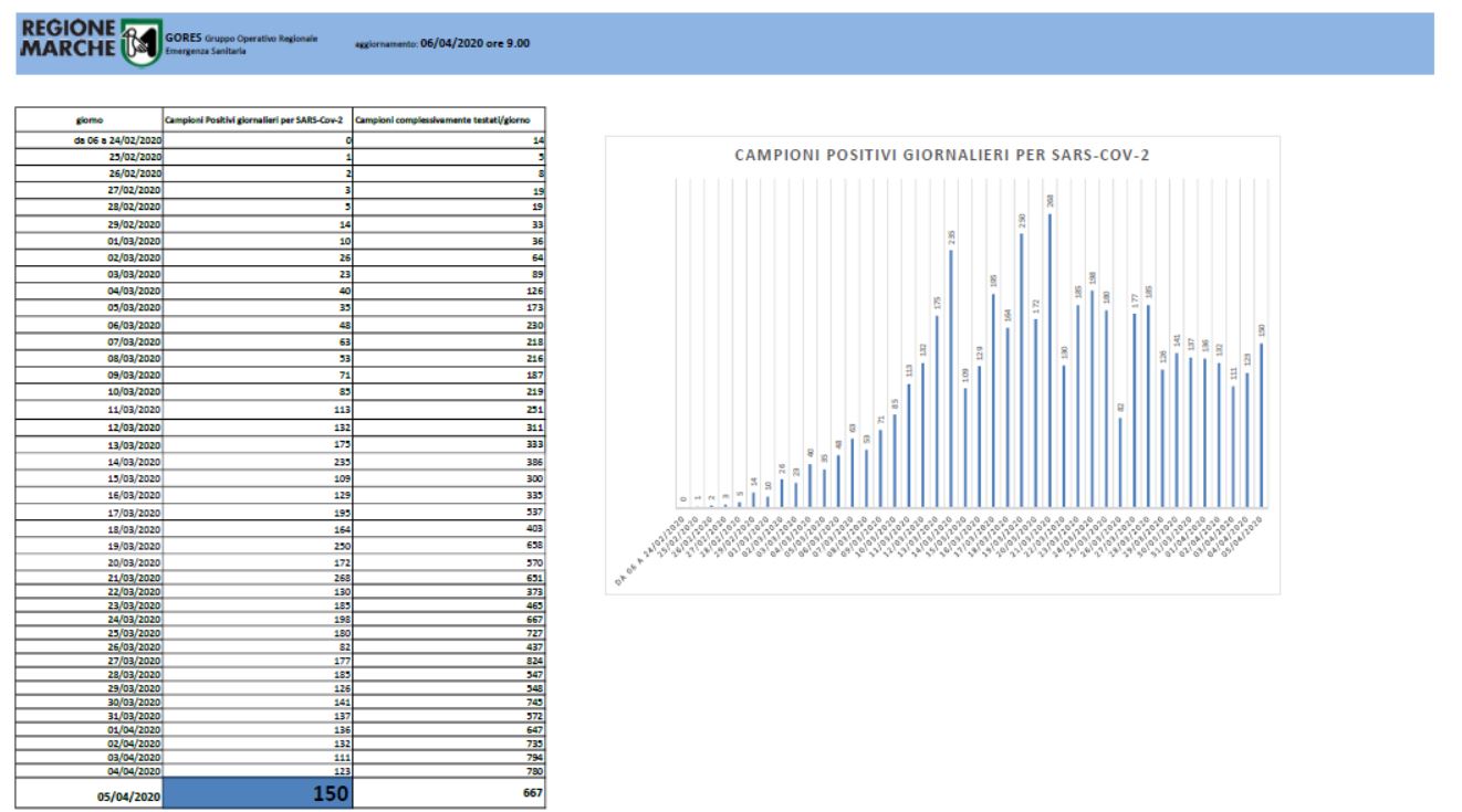 ANCONA – Il Gores (Gruppo Operativo Regionale Emergenza Sanitaria) ha comunicato i risultati delle analisi sui tamponi effettuate nelle ultime 24 ore. Su 667 analizzati sono 150 i positivi. I dati aggiornati alle ore 18 comunicano che sono 18 le persone decedute nelle ultime ventiquattro ore. Di seguito riportiamo le tabelle del Gores: