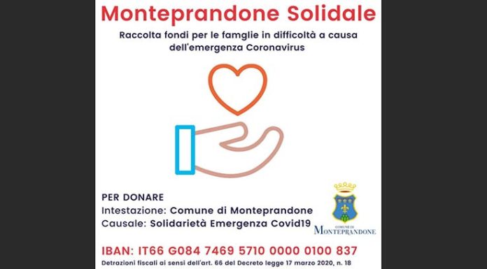 MONTEPRANDONE – Il Comune di Monteprandone ha aperto un apposito conto corrente bancario presso la Banca del Piceno, dove far confluire le donazioni destinate alle misure urgenti di solidarietà, in attuazione di quanto previsto dall’Ordinanza della Protezione civile che ha stanziato le somme destinate all’acquisto di buoni alimentari per sostenere i cittadini in difficoltà in seguito all’emergenza Covid-19.