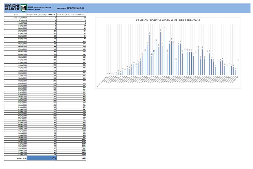 ANCONA – Emergenza Coronavirus. Il Gores (Gruppo Operativo Regionale Emergenza Sanitaria) ha comunicato che sono 76 i tamponi risultati positivi su 1.440 analizzati nelle ultime 24 ore nelle Marche. Un numero che segna una brusca risalita nei nuovi casi, in calo da diversi giorni in contemporanea con l’aumento dei test processati giornalmente. In totale i casi positivi registrati sono 6.028 su 33.113. Di seguito riportiamo le tabelle del Gores: