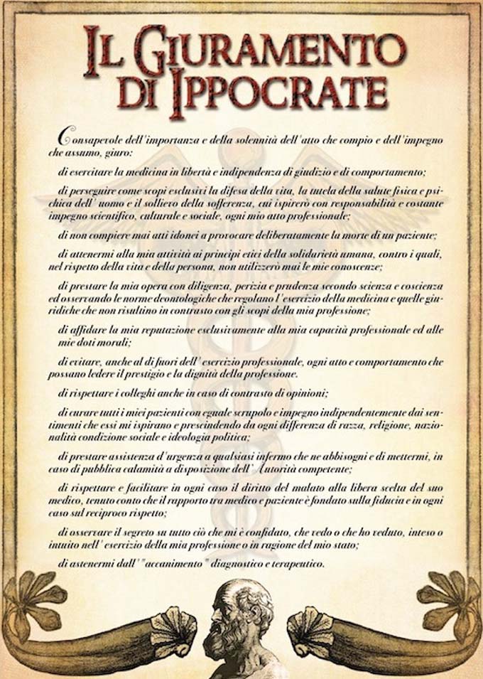 Tra i rimedi, Ippocrate somministrava diete su misura, consigliando anche esercizi fisici. Ovviamente, non esistevano “farmaci” nel senso moderno, per cui faceva ampio ricorso agli infusi erboristici. Sorvolando su molti aspetti, ci interessa arrivare all’anello che lo congiunge a tutti i medici del pianeta, di ogni epoca futura: Il giuramento di Ippocrate. Per lui, il medico ha forti doveri morali, ha una condotta di vita non speculativa e si deve adoperare per la vita del paziente. Un codice articolato, che suscita un certo pathos nel pronunciarlo, al quale i medici, prima di iniziare la professione, debbono fare riferimento prestando “giuramento”.