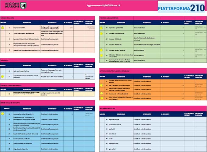 ANCONA – Si è aperta il 17 giugno, con la Misura numero 1, per il sostegno alle imprese e agli operatori del turismo la Piattaforma210, attraverso la quale, cittadini, professionisti e imprese possono presentare domanda di contributi, la maggior parte dei quali a fondo perduto, come sostegno dopo la pandemia Covid-19. A oggi sono 10 le misure aperte e accessibili dal link https://www.regione.marche.it/Entra-in-Regione/Piattaforma-210 : imprese turistiche, operatori agrituristici, imprese florovivistiche, imprese lattiero casearie, allevatori di bovini da carne, acquisto bici e altri veicoli elettrici per i cittadini di comuni esclusi dal contributo nazionale, bar e gelaterie, commercio, altre attività artigianali e di servizi, cooperative sociali di tipo A e B.