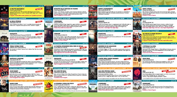 Il calendario della programmazione è molto vario: incontri con i registi, anteprime, ma soprattutto molti film non usciti in sala come I Miserabili di Ladj Ly, Gran Premio della Giuria a Cannes, Favolacce dei fratelli D’Innocenzo Orso d’Argento a Berlino, Tornare di Cristina Comencini. E poi anche i grandi successi, come Parasite di Bong Joon-ho premiato a Cannes e agli Oscar. Torneranno i film per i più giovani, come Trolls World Tour, mai uscito in sala e film da non perdere come Pinocchio di Garrone, o il capolavoro di Mattotti La Famosa invasione degli orsi in Sicila. Come ogni estate, non mancheranno le più belle commedie.