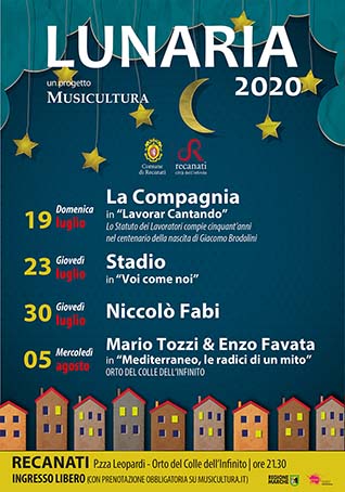Gli appuntamenti in programma sono quattro, tutti ad ingresso gratuito, con prenotazione obbligatoria attraverso www.musicultura.it. Nella centralissima Piazza Leopardi si susseguiranno La Compagnia di Musicultura (19 luglio) in Lavorar Cantando, a cinquant’anni dall’emanazione dello Statuto dei Lavoratori e a cento dalla nascita del suo ispiratore il recanatese Giacomo Brodolini; gli Stadio (23 luglio), con la prima nazionale di Voi come Noi, lo speciale spettacolo con cui la band torna a suonare dal vivo davanti al pubblico (dopo la toccante data zero sul tetto del Padiglione 23 del Policlinico Sant’Orsola di Bologna in omaggio al personale sanitario); Niccolò Fabi (30 luglio) in trio con Roberto Angelini e Pier Cortese. La rassegna si concluderà il 5 agosto nella suggestiva cornice dell’Orto sul Colle dell’Infinito, con Mario Tozzi ed Enzo Favata in “Mediterraneo: le origini del mito”.