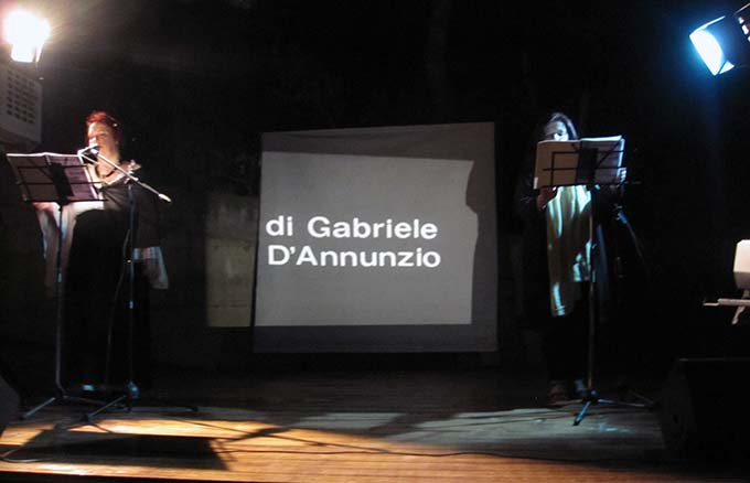 Diapositive sciabolano la penombra, immagini che hanno consegnato il D’Annunzio tribuno e vate all’aneddotica e agli stereotipi del mito; stride la fissità teatrale e sgranata di quelle pose con l’altezza visionaria della parola poetica che le tre voci attoriali attraversano e ri-creano nuova. S’avvicendano e s’inseguono, quelle voci, si sovrappongono, si contrappuntano come strumenti in un’orchestra; si fanno canto, e di quell’arte lussureggiante e sontuosa percorrono ogni intonazione e variazione timbrica, mentre il nostro circoscritto spazio di pini e cielo si dilata nel “jazz lirico” per tromba e bandoneon di Paolo Fresu e Daniele di Bonaventura, tessuto musicale di misticismo austero e mediterraneo calore.