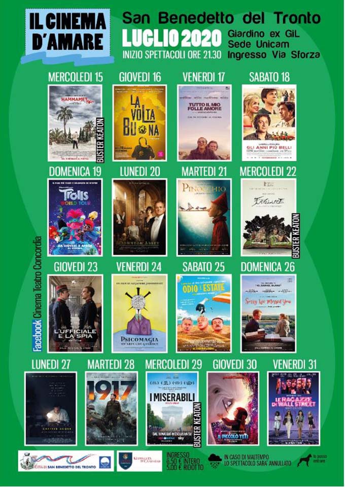 «Ogni sera c’è un film diverso – dice l’assessore alla cultura, Annalisa Ruggieri – commedia, thriller , film per bambini, con un occhio di riguardo per la produzione italiana degli ultimi mesi. Abbiamo lavorato intensamente con gli uffici e con il gestore per attivare “Cinema d’amare” nel minor tempo possibile rispettando le direttive governative in materia di prevenzione del contagio. Uso di mascherina per accedere e distanziamento saranno ovviamente necessari, ma per il resto il godimento dello spettacolo non subirà condizionamenti. E poi voglio sottolineare la rinnovata collaborazione con il Cineforum “Buster Keaton” che già avevamo riportato al Concordia durante l’inverno e che adesso collabora con noi e con il gestore della rassegna per arricchirne il cartellone. Aspettiamo sambenedettesi e turisti per riappropriarci insieme di un altro luogo della cultura».