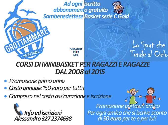 GROTTAMMARE – Grande novità per tutti gli sportivi: dalla competenza e dalla passione della Sambenedettese Basket nasce Grottammare Basketball, per promuovere il nostro meraviglioso sport anche nella Perla dell’Adriatico. Grottammare Basketball organizza nella stagione 2020 – 2021 corsi di Minibasket per ragazzi e ragazze nati dal 2008 al 2015 compresi. I corsi, tenuti da istruttori qualificati, si terranno negli impianti grottammaresi rappresentando per questo una grande ed assoluta novità. In questo primo anno il prezzo di lancio sarà di soli 150 euro, comprensivi di iscrizione ed assicurazione. Solo per gli iscritti al centro minibasket Grottammare Basketball inoltre un abbonamento per l’ingresso gratuito alle gare della Sambenedettese Basket nel prestigioso campionato di Serie C Gold. Sarà inoltre attiva la promozione porta un amico: per ogni amico che si iscriverà uno sconto di 50 euro per entrambi. (per informazioni ed iscrizioni 3272374638)