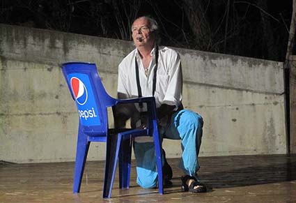 Torna ad essere attore-solista, Di Bonaventura, nella serata dedicata all’Edipo sofocleo. Attrezzi di scena, il palco in legno di larice e una sedia in plastica blu, modello bar-stazione, serigrafata Pepsi Cola: non per sedersi, quando mai una sedia serve a quello… funge invece da tamburo, sostituisce il fido djembè e la percussione accompagna gli stasimi del Coro (se un mister Pepsi vedesse, Vincenzo sarebbe milionario). Si fa in quattro e oltre, l’attore-solista, per la tragedia che avrà forma abbreviata a causa – in questa sera di luglio – del “freddo taciturno di un dicembre ascoso e passeggero” (Di B.): ed è Edipo e Tiresia, è Creonte ed è Giocasta, è lo sciamano e il pastore, ed è il Coro.