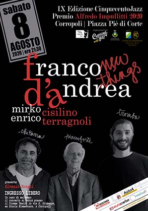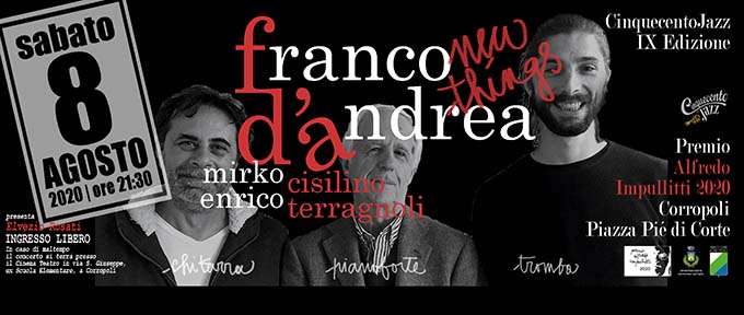 CORROPOLI – Sabato 8 agosto alle ore 21.30, nella splendida Piazza Pié di Corte a Corropoli, il CinquecentoJazz, Festival Jazz giunto alla sua nona edizione estiva, con il patrocinio e il supporto del Comune e della Presidenza del Consiglio Regionale, le attenzioni degli amici e i sostenitori, organizza per il “Premio Alfredo Impullitti 2020” un concerto in memoria, con un ospite di eccezione, destinatario del riconoscimento a suo nome. Sarà la volta del Maestro Franco D’Andrea con il suo recente progetto in Trio. Pianista e compositore, classe 1941, fonte di ispirazione per intere generazioni ed instancabile ricercatore di musica improvvisata. Insieme a lui, suoneranno Enrico Terragnoli alla chitarra ed elettronica e Mirko Cisilino alla tromba. Verrà presentato un nuovo lavoro realizzato con gli stessi musicisti, edito scorso marzo, dal titolo “New Things”.
