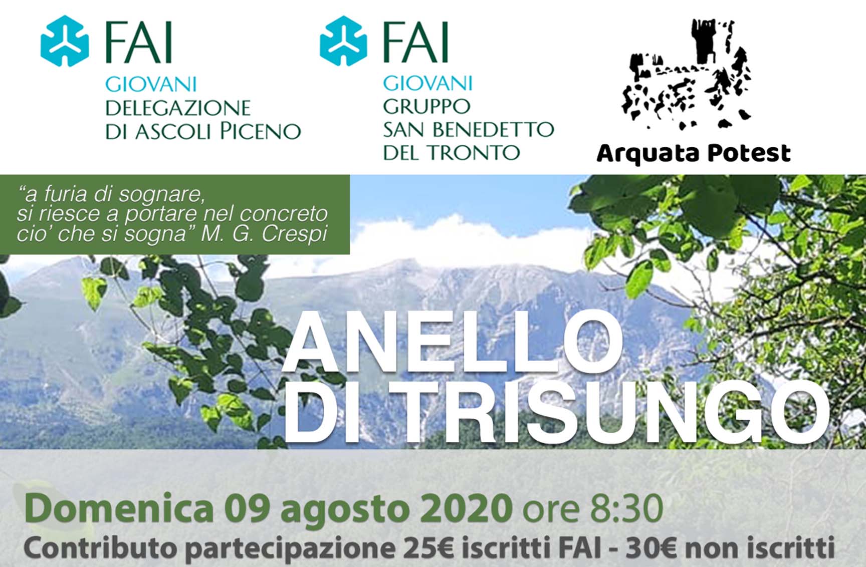 SAN BENEDETTO DEL TRONTO – I gruppi FAI giovani di Ascoli Piceno e San Benedetto del Tronto invitano ragazzi e ragazze (ma non solo) del Piceno a passare una giornata insieme sulle nostre montagne, per riscoprire un territorio che porta ancora le ferite del sisma ma che nasconde tesori tutti da scoprire. L’appuntamento è per domenica 9 agosto alle 8.30 a Trisungo di Arquata del Tronto per percorrere l’Anello di Trisungo insieme all’associazione “Arquata Potest”. La giornata si concluderà poi con un pranzo presso il ristorante “Il Ponticello” di Trisungo. Il costo, comprensivo del pranzo, è di 25 euro per gli iscritti al FAI e di 30 euro per i non iscritti. Verranno rispettati i protocolli di sicurezza previsti dal FAI per la prevenzione del contagio da Covid-19. Per tale motivo la prenotazione, fino a esaurimento posti, è obbligatoria, chiamando il numero 3385362302 o inviando una mail a sanbenedettodeltronto@faigiovani.fondoambiente.it.