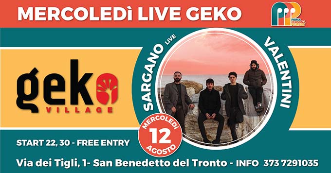 SAN BENEDETTO DEL TRONTO – Quinto appuntamento per i Mercoledì Live Geko di Prima Persona Plurale. Sul palco del locale sambenedettese il 12 agosto saliranno Sargano e Valentini. Apertura porte alle ore 22.30, inizio concerto (ingresso gratuito) 23. L’ingresso al locale dopo il concerto è invece con consumazione obbligatoria (10 euro). Al fine di organizzare al meglio il locale, si richiede la prenotazione contattando il numero 373.7291035 (Michele).
