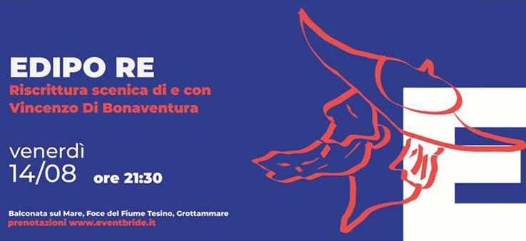 GROTTAMMARE – Arriva la seconda grande serata teatrale negli appuntamenti estivi promossi dall’Associazione Blow Up: un altro straordinario monologo con la riscrittura scenica e l’interpretazione del maestro Vincenzo Di Bonaventura del gruppo “Aoidos” il progetto teatrale guidato dallo stesso Di Bonaventura. Venerdì 14 agosto alle ore 21.30 all’interno del miracoloso cartellone estivo organizzato dal Comune di Grottammare, nella fantastica cornice della Balconata sul Mare presso la foce del fiume Tesino potremo assistere a “Edipo Re”.