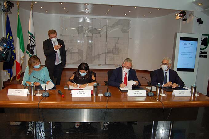 ANCONA – È stato istituito il gruppo di lavoro congiunto che dovrà individuare gli interventi, infrastrutturali e tecnologici, per migliorare il collegamento ferroviario tra la dorsale tirrenica (Firenze – Orte – Roma) e la direttrice adriatica. L’obiettivo è quello di riqualificare l’esistente tratta “Orte – Falconara”, per larga parte ancora a binario unico, che congiunge le Marche e l’Umbria alla Capitale, attraversando l’Appennino centrale. Il protocollo d’intesa mira a realizzare un itinerario adeguato al traffico passeggeri e merci. È stato firmato, oggi, presso la sede della Giunta regionale di Ancona, dal ministro delle Infrastrutture e dei Trasporti Paola De Micheli, dai governatori di Marche e Umbria Luca Ceriscioli e Donatella Tesei, dall’ amministratore delegato e direttore generale di Rete ferroviaria italiana (Gruppo FS Italiane) Maurizio Gentile. Il tema del trasporto ferroviario “sarà centrale tra gli investimenti finanziati con il Recovery plan – ha detto il ministro – Investimenti strategici per lo sviluppo delle aree interne che racchiudono luoghi di straordinaria ricchezza ma poveri di infrastrutture. Dopo anni di discussione, passiamo alla fase delle decisioni”.