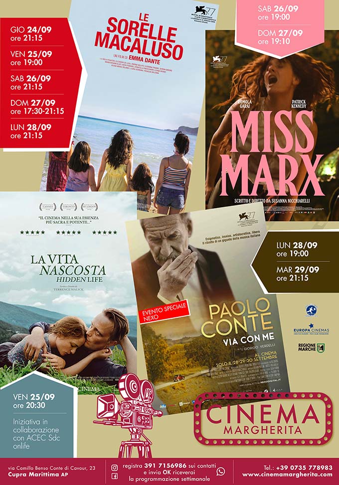 CUPRA MARITTIMA – Al Cinema Margherita di Cupra Marittima continuano le proposte cinematografiche provenienti dalla Mostra del Cinema di Venezia 2020, con il film della poliedrica e militante regista Emma Dante, “Le sorelle Macaluso” la storia di cinque sorelle nella periferia di Palermo ed il documentario musicale, evento speciale, del grande musicista astigiano “Paolo Conte, Via con me” di Giorgio Verdelli, entrambi molto applauditi al festival da stampa e pubblico. Prosegue inoltre la programmazione del film biopic “Miss Marx” sulla vita di Eleanor Marx, figlia di Karl, donna colta, libera e appassionata. Da evidenziare l’appuntamento di venerdì 25 ore 20,30 (spettacolo unico) dell’ultimo film di Terence Malik “La vita nascosta” in concorso a Cannes 2019: il suo cinema è sempre essenziale, potente e sacro. Quest’ultimo è una iniziativa in collaborazione con Acec (Associazione Cattolica Esercenti Cinema), in occasione delle Giornate Sdc onlife 24-26/09, è proiettato in contemporanea con altri cinema Italiani.