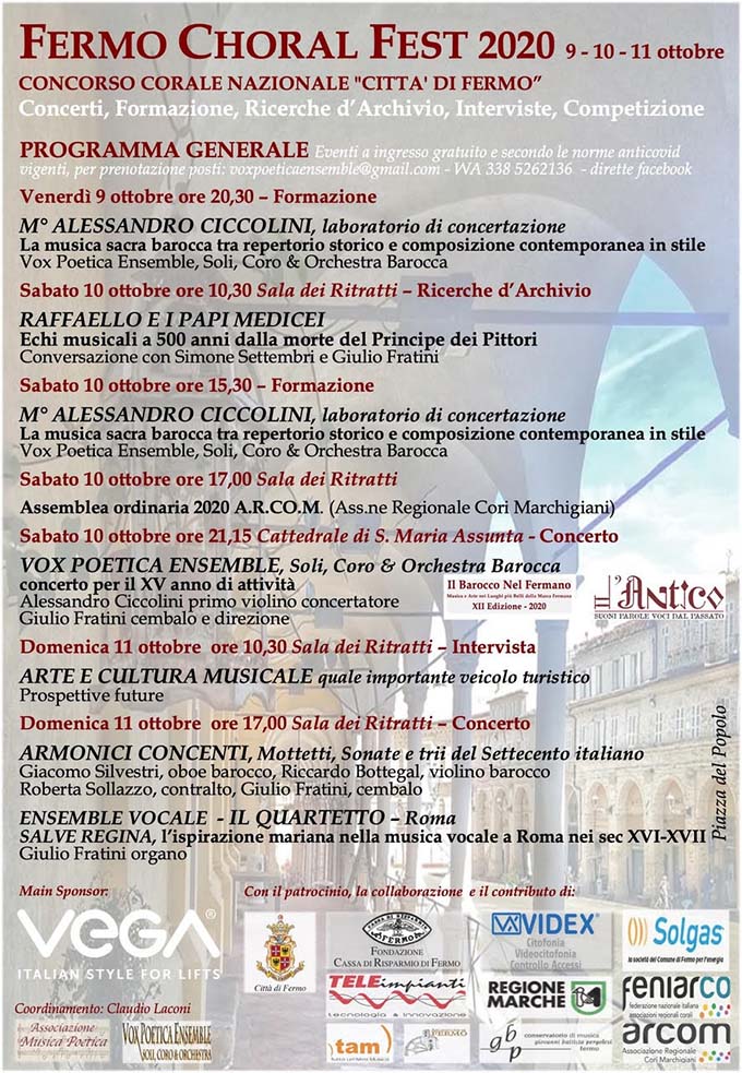 FERMO – Prende il via dal 9 all’11 ottobre il Concorso Corale Nazionale “Città di Fermo” con una serie di concerti, formazione, ricerche d’archivio, interviste e competizione grazie alla collaborazione dell’Associazione Musica Poetica, Vox Poetica Ensemble e TAM Tutta un’Altra Musica. Si inizierà venerdì 9 ottobre alle ore 20.30 con il maestro Alessandro Ciccolini che terrà un laboratorio di concertazione intitolato “La musica sacra Barocca tra repertorio storico e composizione contemporanea in stile” con la Vox Poetica Ensemble, Soli, Coro & Orchestra Barocca.