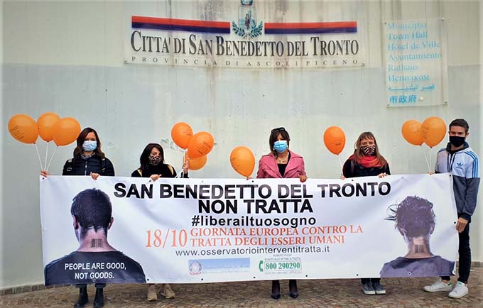SAN BENEDETTO DEL TRONTO – L’Assessorato alle Pari Opportunità del Comune di San Benedetto del Tronto ha accolto la proposta dell’associazione “On The Road” di esporre uno striscione in occasione della XIV Giornata Europea contro la tratta di esseri umani che ricorre il 18 ottobre 2020. Lo striscione con la scritta “San Benedetto del Tronto non tratta” rimarrà appeso negli spazi esterni del Comune dal 13 al 30 ottobre. «Sono grata al lavoro che sta svolgendo l’associazione On The Road nel nostro territorio ed ho accolto con entusiasmo la loro proposta – dice l’assessore Antonella Baiocchi – sia perché il fenomeno della tratta degli esseri umani è più vicino a noi di quanto si pensi interessando concretamente anche le regioni Marche e Abruzzo, sia perché il fenomeno è l’esempio eclatante di quanto questa Amministrazione sta affermando da anni: la violenza non è una questione di sesso ma di una cultura “analfabeta” che, invece di amore e rispetto, divulga egocentrismo, odio, invidia e possesso impedendo la gestione armoniosa tra le diversità in favore della cosiddetta “gestione dicotomica delle divergenze».