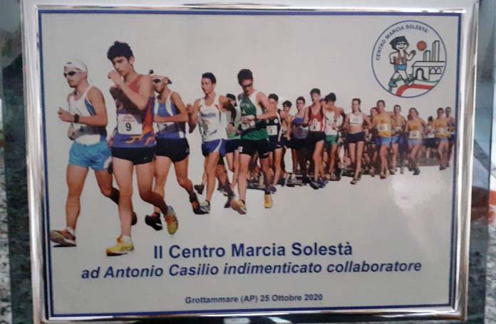 A conclusione della competizione, il Centro Marcia Borgo Solestà ha voluto dedicare un trofeo ad Antonio Casilio, socio onorario e sportivo appassionato. La famiglia, la moglie Lavinia, i figli e il nipote Ernesto, ringraziano gli organizzatori tutti e, in particolare, Vincenzo Ferretti per questo gesto che, in questo anno vissuto all’insegna dell’emergenza, e nel primo anniversario della scomparsa di Antonio, acquista un valore speciale e carico di significati. È come se Antonio avesse partecipato anche questa volta: in qualche modo era lì, su e giù con la bicicletta, da un capo all’altro del lungomare, a guardare quei giovani correre. Proprio lui che giovane lo è sempre stato, nello spirito e nell’entusiasmo, fino alla fine e anche oltre.