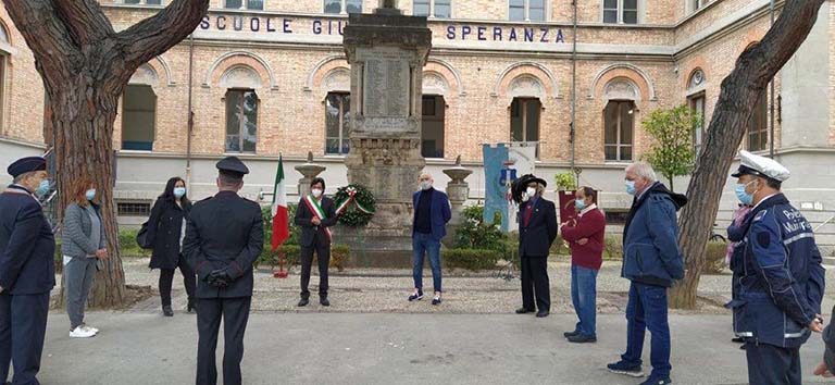 GROTTAMMARE – Si è svolta questa mattina la celebrazione del IV Novembre, con l’apposizione di una corona d’alloro davanti al Monumento ai Caduti che si trova nel piazzale del plesso scolastico “Giuseppe Speranza”. Nelle parole del sindaco Enrico Piergallini e del presidente del Consiglio comunale Stefano Troli, il ricordo di tante giovani vite spezzate, dei sacrifici delle famiglie, ma anche della rinascita che comunque seguì a tanto dolore: «Oggi più che mai possiamo comprendere la tragedia che quella generazione fu costretta a sopportare e superare. Tutti noi stiamo affrontando molti sacrifici in questa emergenza sanitaria, essi però non sono affatto paragonabili a quelli che le popolazioni del mondo furono costrette ad affrontare tra il 1914 e il 1918, aggravati negli anni immediatamente successivi dalla terribile epidemia di spagnola. Città distrutte, giovani mandati a morire nelle trincee per la conquista di pochi metri di terreno, milioni di morti tra i civili. Eppure quel mondo riuscì a risollevarsi e lo fece di nuovo dopo la seconda guerra mondale. Sia d’esempio per tutti, soprattutto nei momenti di scoramento. E sia anche un motivo per tenerci stretti alla casa comune europea, senza dubbio piena di conflitti e contraddizioni, ma che ha comunque garantito il più lungo periodo di pace nel nostro continente». Causa emergenza sanitaria, la cerimonia si è svolta alla presenza delle sole autorità. Oltre a quelle comunali, erano presenti  Domenico Princigalli (Comandante locale stazione dei Carabinieri), Bruno Lucciarini De Vincenzi (Presidente Associazione Nazionale Carabinieri in congedo), Pino Scartozzi (Presidente Associazione nazionale Bersaglieri sez. Enrico Toti), Luigina Silvestri (Dirigente scolastica Istituto Leopardi).