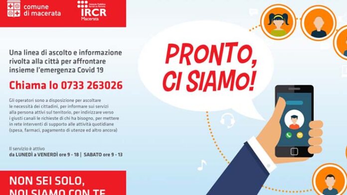 MACERATA – Il Comune di Macerata, in collaborazione con l’Azienda Pubblica Servizi alla Persona Ircr,  mette in campo il progetto di solidarietà “Pronto, ci siamo!”, un servizio per essere al fianco dei cittadini e affrontare in maniera più agevole questo periodo di emergenza sanitaria. Si tratta di uno sportello di orientamento rivolto all’intera popolazione per tutte le necessità che emergono a causa della delicata situazione epidemiologica da Covid 19, un servizio in grado di offrire risposte concrete grazie anche alla sinergia con le tante associazioni che operano a Macerata, in diversi ambiti, ma anche uno spazio di ascolto e di accoglienza. Obiettivi di “Pronto, ci siamo!”, che risponde al numero 0733.263026, sono infatti il contrasto al senso di solitudine, fornire supporto e informazioni mirate e infine quello di mettere in rete le risorse presenti nel territorio. Gli operatori di “Pronto, ci siamo!” sono a disposizione per informare i cittadini sui servizi attivi, per indirizzare verso i giusti canali le richieste di chi ha bisogno, per mettere in rete interventi di supporto alle attività quotidiane. I cittadini, ad esempio, hanno la possibilità di avere informazioni sui servizi funzionanti nel proprio quartiere, dalle farmacie agli esercizi commerciali, compresi i supermercati, che offrono la consegna dei beni a domicilio o magari chiedere supporto per il pagamento delle utenze e così via. Lo sportello è attivo fino al 31 dicembre, con possibilità di proroga in base all’evoluzione dell’emergenza, dal lunedì al venerdì dalle 9 del mattino alle 18 e il sabato dalle 9 alle 13.