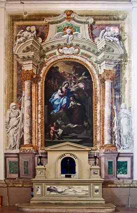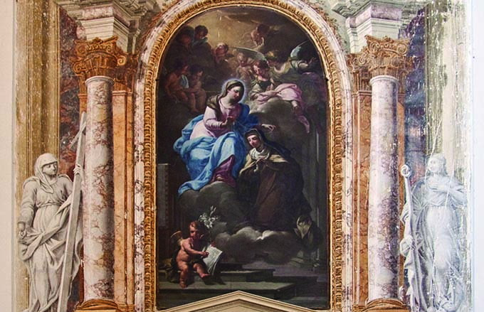 al sito https://www.coopalleanza3-0.it/1-per-tutti-4-per-te/votazioni-opere. La pala in questione raffigura Santa Maria dei Pazzi nel momento in cui la Vergine Maria le ricopre il capo con un leggerissimo velo trasparente. L’atto sta ad indicare la protezione che Maria esercita sulla devota e riverente carmelitana. La firma dell’autore, posta sulla destra, reca la scritt a”Philippus. Palazzettus. Maceraten. Fecit. AN MCCXXXVI. AETAT XXV”. La cappella, che ospitava questo dipinto nel Santuario di Santa Maria delle Vergini, fu eretta alla fine del XVII secolo in onore di S. Maddalena de’ Pazzi, suora carmelitana canonizzata nel 1670. L’opera mostra uno stato conservativo che penalizza il suo messaggio artistico e devozionale. La superficie è appiattita dallo spesso strato di sedimenti accumulatisi nel tempo, costituiti principalmente da pulviscolo atmosferico misto a fumo di candele che, depositandosi sulla vernice di protezione, si è trasformato in un filtro opaco e scuro capace di alterare l’originale cromia e l’immediata percezione della composizione.