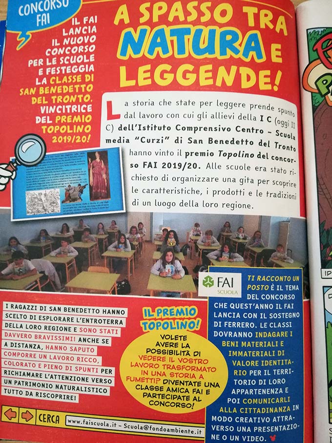 SAN BENEDETTO DEL TRONTO – Paperino va per la prima volta alla scoperta della Sibilla in un’avventura ispirata dagli studenti della classe II C della scuola media Curzi di San Benedetto. É in edicola il nuovo numero di “Topolino”, il popolarissimo settimanale Disney, con la storia dal titolo “Paperino, Paperotto e i sentieri del bosco” realizzata grazie al lavoro degli studenti sambenedettesi, che la sceneggiatrice Valentina Camerini e il disegnatore Luca Usai hanno trasformato in un inedito fumetto. Paperino e i suoi amici vanno in gita sui monti, perdono il sentiero e… fanno l’incontro con Sibilla, misteriosa donna che abita in montagna. La storia, oltre a richiamare il mito della fata Sibilla, ricorda l’importanza di tenere puliti i sentieri perché siano percorribili. Un tema particolarmente importante per un territorio come quello montano a forte rischio di abbandono dopo i danni causati dal terremoto. A corredo del fumetto, una foto degli alunni e un piccolo estratto del loro lavoro. Una grande soddisfazione per i ragazzi e per l’insegnante Catia Cichetti, che ha coordinato il progetto, ma anche una preziosa occasione di promozione delle bellezze e della storia del Piceno destinata a entrare nelle case di decine di migliaia di famiglie italiane. L’iniziativa è nata grazie a un concorso nazionale del Fai – Fondo Ambiente Italiano dedicato alle catene montuose italiane, dal titolo “Il paesaggio dell’Alpe”. Gli alunni dell’istituto diretto da Laura D’Ignazi hanno ideato un articolato viaggio virtuale alla scoperta della Sibilla che ha sbaragliato la concorrenza dei diecimila coetanei in lizza, aggiudicandosi il primo premio che ha dato loro la possibilità di finire su Topolino e vedere il loro lavoro diventare una storia a fumetti. Il progetto “In gita sui Monti Sibillini- sulla montagna magica” è visibile per intero sul sito del Fai, mediante il seguente link: https://www.fondoambiente.it/il-fai/scuola/progetti-fai-scuola/educazione-ambientale/concorsi-nazionali/i-vincitori/