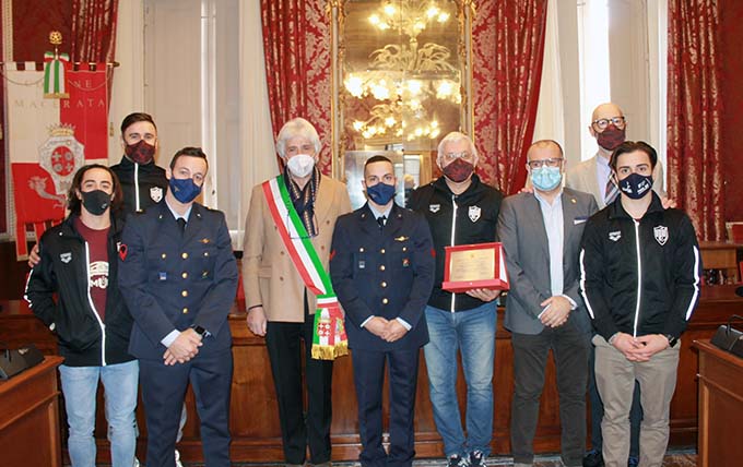«É questa la Macerata che vogliamo.» ha esordito l’assessore Sacchi nel dare il benvenuto alla squadra «Con impegno, tenacia, sacrificio e risultati avete tradotto nei fatti quella che è la visione dello sport nel programma dell’Amministrazione comunale dove le attività sportive hanno un ruolo assolutamente centrale. Per questo, iniziando dal vostro risultato, diamo vita all’iniziativa MacerataPiù per valorizzare e premiare le eccellenze sportive di Macerata. La città ha bisogno di un segno positivo e lo sport rappresenta un’attività essenziale e insostituibile per il benessere di una comunità e anche un valido strumento di prevenzione dalle dipendenze. Grazie ragazzi, Macerata è fiera di voi».