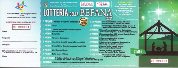ASCOLI PICENO – Uno scooter elettrico, una Tv da 43 pollici, un quadro del pittore Claudio Angelini e poi biciclette, percorsi benessere, macchine da caffè e numerosi buoni per visite oculistiche, servizi dal parrucchiere e ristoranti. La storica Lotteria della Befana dell’Unione Ciechi e Ipovedenti di Ascoli Piceno e Fermo non si fa intimorire dal Covid e propone una edizione 2020 che fa volare sul web desideri e progetti. «Sì, perché con i fondi che riusciremo a raccogliere – spiega la presidente Uici territoriale, Gigliola Chiappini – realizzeremo una cabina di registrazione per libri e musica dedicata ai nostri soci». Giunta alla tredicesima edizione, la Lotteria quest’anno sbarca online con una serie di dirette web molto divertenti e partecipate per la vendita dei biglietti. «Uno degli appuntamenti più attesi – sottolinea la presidente – è per domenica 13 dicembre quando celebreremo Santa Lucia con una edizione speciale della diretta, a cui è possibile partecipare dalla nostra pagina Facebook (https://www.facebook.com/Unione-Italiana-Ciechi-di-Ascoli-Piceno-e-Fermo-101088836943845)».«La Lotteria – prosegue Gigliola Chiappini – è un’importante fonte di sostentamento per le attività dell’Unione Ciechi e Ipovedenti: i fondi che raccogliamo ogni anno ci permettono di garantire servizi e tutelare le persone con disabilità visiva. Per noi questo appuntamento ultradecennale è una risorsa fondamentale. Quest’anno il nostro sogno è realizzare una cabina di registrazione per permettere di rendere accessibile la cultura attraverso la lettura di testi e l’ascolto di brani musicali». I biglietti possono essere acquistati online, ogni lunedì alle 19.00 attraverso le dirette Facebook, telefonicamente allo 0736.250133 o direttamente in sede, in via Copernico, 8 ad Ascoli Piceno. L’estrazione è prevista per il 6 gennaio.
