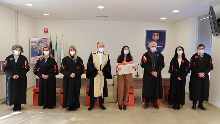 CAMERINO – L’Università di Camerino non si è mai fermata in questi mesi di emergenza sanitaria, continuando ad erogare la didattica in modalità telematica e consentendo alle studentesse ed agli studenti di poter concludere il proprio percorso di studi nei tempi previsti. Si è infatti tenuta nel primo pomeriggio di oggi, di nuovo in presenza, come consentito dalla normativa e nel rispetto di tutte le norme di sicurezza, la discussione della tesi e la consegna dell’attestato degli studi compiuti presso la Scuola di Studi Superiori “Carlo Urbani” all’allieva Angelica Mogianesi. Molto emozionati per questa prova di ritorno alla normalità e per l’importante traguardo raggiunto dalla dott.ssa Mogianesi tutti i presenti, sia il Rettore Unicam Claudio Pettinari e la Direttrice della Scuola Urbani Loredana Cappellacci, che i familiari dell’allieva. La Scuola di Studi Superiori “Carlo Urbani” rappresenta un percorso di eccellenza per valorizzare giovani talenti e lo ha pienamente dimostrato anche la giovane neodiplomata, che dopo aver conseguito brillantemente la laurea magistrale a ciclo unico in Giurisprudenza in Unicam, ha ottenuto il diploma della Scuola con una votazione di 100 su 100 e lode.