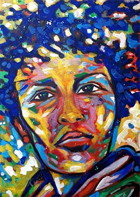 Carlo mi invia il dipinto in cui è ritratta Agitu. Rimango senza parole tanto è bello e tanta è la dignità, il coraggio, la forza che trasmette. Carlo ha raggiunto in questa opera uno dei vertici più alti della sua arte. Per un attimo penso di essere inadeguato a scrivere qualcosa: sono troppe le emozioni che suscita. Mi viene in aiuto l’incipit illuminante del testo Diarmonia: «L’opera d’arte parla da sé». Ma per ascoltare una voce bisogna predisporsi in silenzioso e aperto ascolto. Difatti il dipinto inizia a parlare: attraverso l’esplosione di colori, caratteristica delle opere di Carlo Gentili. E i colori raccontano. I marroni e rossi dell’Etiopia, il paese d’origine di Agitu, della sua terra alta, dura, conflittuale. Ancora marroni e rossi di altre tonalità che Agitu ritrovò sulle montagne del Trentino. A cui si aggiunsero i verdi e gli ocra dei boschi e dell’erba, dove brucavano le sue capre pezzate. Il blu e l’azzurro poi raccontano il cielo puro e chiaro, a volte cupo, sia d’Etiopia che d’Italia; e i mari, i fiumi, i ruscelli.