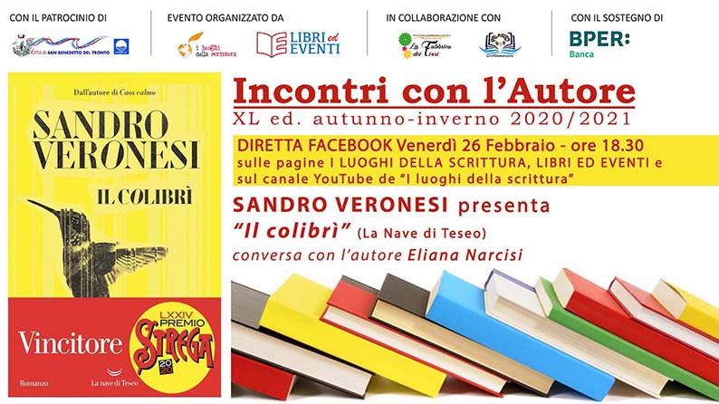 SAN BENEDETTO DEL TRONTO – L’associazione culturale “I luoghi della scrittura” nell’ambito della rassegna “Incontri con l’Autore online: XL ed. inverno-primavera 2020/2021” ospiterà il Vincitore del Premio 2020, Sandro Veronesi. A conversare con l’autore sarà Eliana Narcisi. L’evento si svolgerà venerdì 26 febbraio alle ore 18.30 sulle pagine facebbok e sul canale YouTube de “I luoghi della scrittura”.