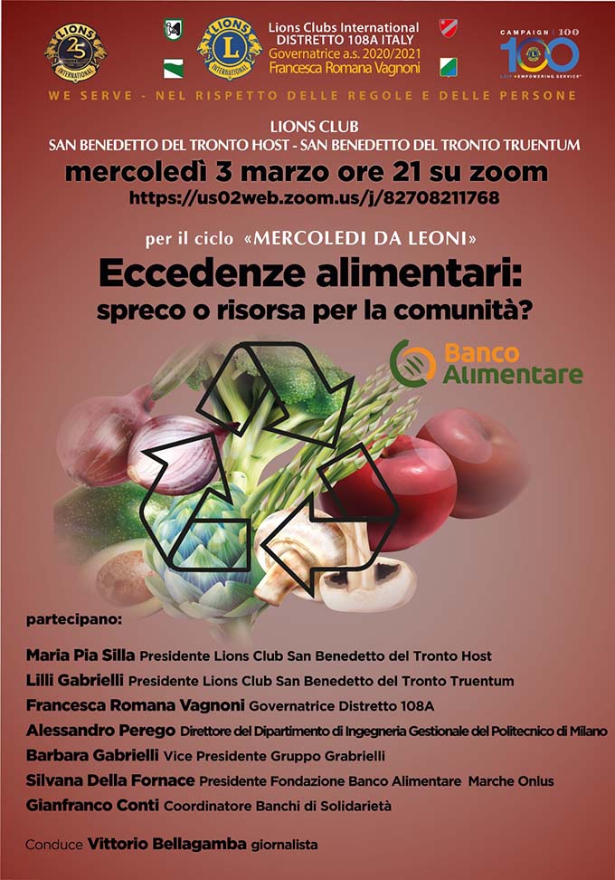 SAN BENEDETTO DEL TRONTO – Il 3 marzo 2021 si terrà, su piattaforma digitale a partire dalle ore 21, il webinar gratuito Eccedenze alimentari: spreco o risorsa per la comunità? organizzato dai Lions Club di San Benedetto del Tronto, Host e Truentum e dalla Fondazione Banco Alimentare Marche Onlus. «Noi Lions, in questo anno sociale – ricorda Maria Pia Silla, Presidente del Lions Club San Benedetto Host – vogliamo affiancare quelle strutture, associazioni e fondazioni, in particolare il Banco Alimentare, che cercano di far fronte ad uno dei fenomeni più preoccupanti derivanti dalla pandemia, quello delle “nuove povertà”, che porta intere famiglie a non poter soddisfare uno dei bisogni primari, quello alimentare. Questo discorso è ovviamente correlato a quello dello spreco alimentare ed a quanto la riduzione dello spreco potrebbe trasformarsi in risorsa per sostenere persone in difficoltà oggettiva».