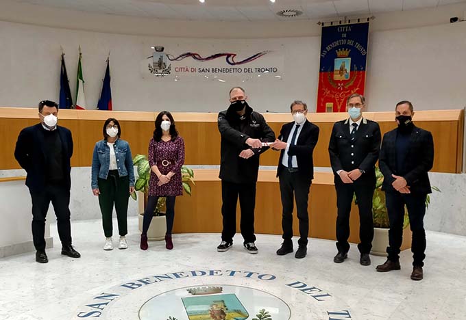 SAN BENEDETTO DEL TRONTO – Questa mattina il sindaco Pasqualino Piunti, il comandante della Polizia Municipale Giuseppe Coccia, la rappresentante del Comitato di quartiere Marina Centro Leandra Mattioli e alcuni assessori hanno ringraziato ufficialmente Hendal – Fifa Security, istituto di vigilanza privata con sede in città, per aver offerto la propria disponibilità ad effettuare a titolo gratuito il servizio di apertura e chiusura quotidiana dei cancelli del “pontino lungo”. A ricevere i ringraziamenti dell’Amministrazione è stato Filiberto D’Angelo, contitolare dell’azienda. L’infrastruttura, recentemente riqualificata con artistici murales che adorano le pareti, per lungo tempo è stata oggetto di atti di vandalismo e teatro di vicende di cronaca che hanno generato preoccupazione nella cittadinanza. Con ordinanza contingibile ed urgente, il Sindaco ne ha dunque disposto la chiusura al transito dalle 22 alle 6 almeno fino alla avvenuta installazione delle telecamere del sistema di videosorveglianza pubblico. Alla luce del provvedimento che ha sospeso temporaneamente il servizio di refezione scolastica in alcuni plessi della città per l’inasprirsi della diffusione del contagio, il sindaco Pasqualino Piunti ha dato disposizione affinché le derrate alimentari già acquistate vengano devolute alla Caritas diocesana.