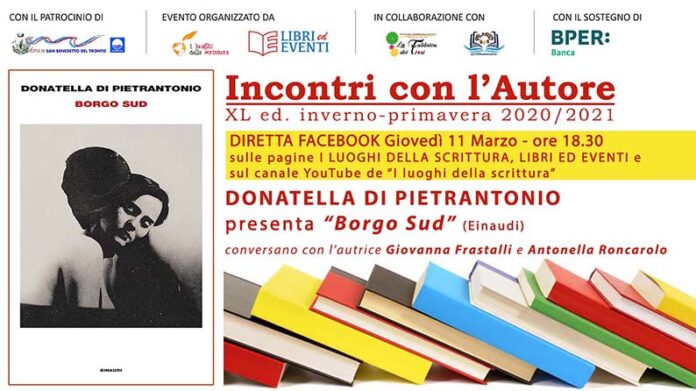 SAN BENEDETTO DEL TRONTO – Giovedì 11 marzo la scrittrice Donatella Di Pietrantonio sarà ospite dell’associazione culturale “I Luoghi della Scrittura” nell’ambito della rassegna “Incontri con l’Autore: XL ed. inverno-primavera 2020/2021”. Conversano con l’autrice Giovanna Frastalli e Antonella Roncarolo. L’evento sarà in diretta alle ore 18.30 sulle pagine Facebook dell’associazione e sul canale Youtube de “I luoghi della scrittura”. Donatella Di Pietrantonio presenterà il suo ultimo libro “Borgo Sud” (Einaudi). Dopo “L’Arminuta” l’autrice torna con un nuovo romanzo “intenso, duro e tagliente come un rasoio”, candidato da Nadia Fusini al Premio Strega 2021: Adriana è come un vento, irrompe sempre nella vita di sua sorella con la forza di una rivelazione. Sono state bambine riottose e complici, figlie di nessuna madre. Ora sono donne cariche di slanci e di sbagli, di delusioni e possibilità, con un’eredità di parole non dette e attenzioni intermittenti. Vivono due grandi amori, sacri e un po’ storti, irreparabili come sono a volte gli amori incontrati da giovani. Ma per chi non conosce la lingua dell’affetto è molto difficile aprire il cuore. Con la sapienza e la naturalezza dei grandi scrittori, Donatella Di Pietrantonio ci regala in queste pagine un’emozione calda e sussurrata, che rimarrà con noi a lungo. L’evento è patrocinato dal Comune di San Benedetto del Tronto, organizzato da Mimmo Minuto, I Luoghi della Scrittura e dalla Libreria Libri ed Eventi, in collaborazione con La Fabbrica dei Fiori e Pelasgo Grottammare e con il sostegno di BPER Banca.
