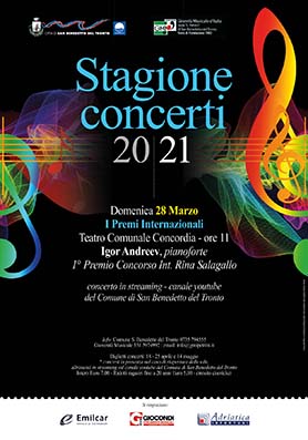 SAN BENEDETTO DEL TRONTO – Prosegue la stagione dei concerti 2020-2021 realizzata dal Comune di San Benedetto del Tronto in collaborazione con la Fondazione “Gioventù Musicale d’Italia”. Domenica 28 marzo, alle ore 11, in streaming dal Teatro Concordia sul canale YouTube del Comune di San Benedetto del Tronto, sarà proposta l’esibizione del pianista russo Igor Andreev, vincitore del prestigioso concorso internazionale “Rina Sala Gallo”. In programma la famosa Sonata op. 109 di L. v. Beethoven, 4 Mazurke di Chopin e brani tratti da Images e da Prèludes di Debussy.