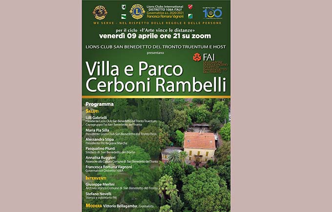 SAN BENEDETTO DEL TRONTO – La Villa e il parco Cerboni Rambelli costituiscono due degli elementi caratterizzanti del patrimonio artistico e culturale di San Benedetto del Tronto. Tra i siti più votati nel concorso dei Luoghi del Cuore del Fai – Fondo Ambiente Italiano a livello nazionale e al primo posto nelle Marche con 13.358 voti, l’attenzione sulla villa e il parco Cerboni Rambelli è molto aumentata di recente. Per conoscere ancor meglio la situazione della villa e del parco e per capire quali possono essere le prospettive future i Lions Club Truentum e San Benedetto Host oltre al Gruppo Fai di San Benedetto hanno organizzato per domani sera (Venerdì 9 Aprile 2021) con inizio alle ore 21 sulla piattaforma Zoom un convegno. I lavori saranno aperti dall’intervento della Governatrice del Distretto 108/A del Lions Club Francesca Romana Vagnoni e, a seguire, formuleranno un saluto il sindaco di San Benedetto Pasqualino Piunti, la presidentessa del Lions Club Truentum Lilli Gabrielli nonché capogruppo FAI di San Benedetto, Albino Farina per il Club Lions San Benedetto Host, l’assessore Annalisa Ruggeri, la presidentessa del Fai Marche Alessandra Stipa. Le relazioni saranno curate dal responsabile dell’Archivio Storico del comune di San Benedetto Giuseppe Merlini il quale tratterà il tema: “Una lunga storia di amore con San Benedetto del Tronto” mentre lo storico Stefano Novelli illustrerà i risultati di una analisi sul tema “Da villa di campagna a Parco Urbano”. Il convegno sarà moderato dal giornalista Vittorio Bellagamba. La Villa Cerboni Rambelli venne costruita alla fine del 1800 dal Dott.Angelo Cerboni Baiardi. Il Dottor Cerboni, giunto in questa città per svolgere la sua professione di chirurgo, volle costruirvi una casa importante che in seguito divenne la dimora di Anna Maria Sestili e del dott. Rambelli, suo marito. La villa è composta da un corpo centrale, a pianta quadrata, di tre piani al quale si affiancano due corpi laterali, a pianta rettangolare, più bassi, di soli due piani che terminano con due terrazze che si affacciano sul mare adriatico ad est,sul paese a nord e sulla campagna circostante nelle altre direzioni. La villa ha anche un parco di circa 12000mq che ha le caratteristiche del Giardino all’Italiana con un aspetto molto elegante e una notevole varietà di essenze arboree che crescono tra elementi di arredo e zone relax riservate. Dal 2001 dopo la scomparsa, nel 1998, del dott. Rambelli la villa, per disposizione testamentaria di quest’ultimo, è patrimonio del Comune di San Benedetto.