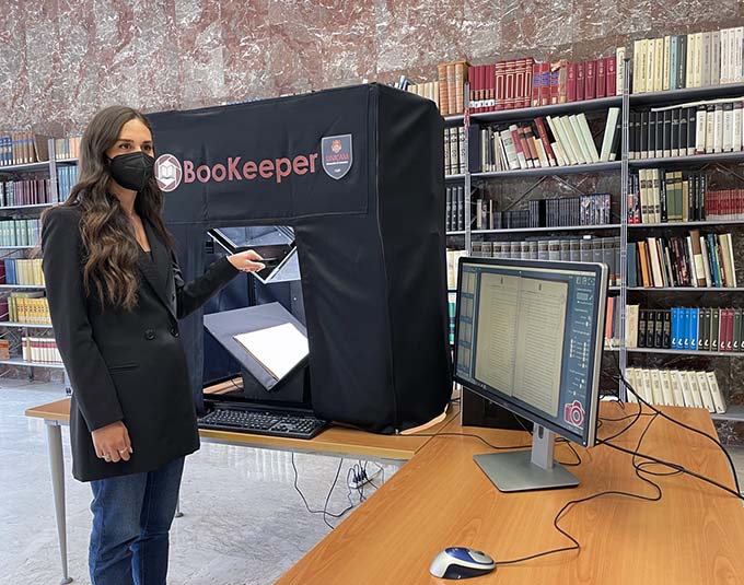 La workstation di BookKeeper permette di digitalizzare testi antichi preservandone l’integrità grazie ad un piano di scansione a “V” che non danneggia la rilegatura, uno scanner in plexiglas che tiene aperte le pagine evitando che vengano distese con le dita, due fotocamere Canon che acquisiscono le immagini prive di curvatura, la camera oscura con illuminazione a led e foto su sfondo nero per una perfetta resa fotografica. Grazie all’innovativo software le scansioni non hanno bisogno di post produzione, scatti e ritagli automatici permettono la messa on line diretta delle pagine del libro.