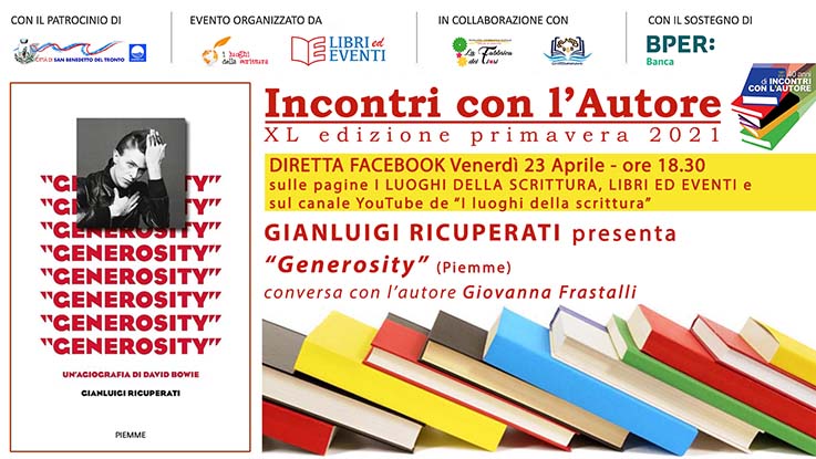 SAN BENEDETTO DEL TRONTO – Venerdì 23 aprile lo scrittore Gianluigi Ricuperati sarà ospite dell’associazione culturale “I Luoghi della Scrittura” nell’ambito della rassegna “Incontri con l’Autore: XL ed. primavera 2021”. Conversa con l’autore Giovanna Frastalli. L’evento sarà in diretta alle ore 18.30 sulle pagine Facebook dell’associazione e sul canale Youtube de “I luoghi della scrittura”. Gianluigi Ricuperati presenta il suo ultimo libro “Generosity” (Piemme). Uno scrittore visionario come Gianluigi Ricuperati interpreta il mito di David Bowie sotto la lente delle vite dei santi, con uno stile originalissimo, insieme emotivo e cerebrale. David Robert Jones è stato un artista unico, ma la sua unicità – a differenza di altre rockstar – non si è basata su un modello tolemaico dell’ego, ma su una costellazione, su un arcipelago di incontri, relazioni, ispirazioni, modelli, amici, eroi e avventure. Tutte le persone più vicine al Duca Bianco, scomparso cinque anni fa, ne hanno sempre elogiato la peculiare generosità. La generosità non è dare un pezzo di ciò che si ha. È dare più di quanto si ha. Contraendo un debito con l’essere, si produce un’energia meravigliosa che funziona quasi come un pilota automatico. La storia del Duca Bianco, delle sue mille trasformazioni, delle sue canzoni e dei libri che ha letto attraverso gli episodi di generosità che costellano gli anni terreni di David Robert Jones, l’uomo delle stelle, il pensatore segreto, l’icona gender fluid, il crooner, l’attore, il pittore, il collezionista, il businessman.