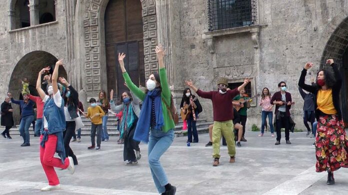 ASCOLI PICENO – Il primo maggio, festa dei lavoratori, un gruppo di professionisti dello spettacolo e liberi cittadini di tutte le età è sceso in piazza per riportare nello spazio pubblico un momento d’arte, espressione per eccellenza dell’animo umano. L’ispirazione è arrivata da un gruppo di artisti che ha svolto il flashmob in una stazione parigina: l’azione si sta diffondendo in diversi paesi europei e la canzone “danser encore” da settimane viene tradotta in tutte le lingue. Per l’occasione è stata anche tradotta e riadattata in italiano. Il flashmob si è svolto consecutivamente in tre diverse piazze della città e ha coinvolto anche passanti che hanno aderito spontaneamente al momento di festa che si è creato, sempre nel rispetto delle normative vigenti in materia di sicurezza sanitaria. Questi gruppi artistici estemporanei si sono creati senza una vera organizzazione: la “chiamata alle arti” si è diffusa attraverso una catena di condivisione tra amici, colleghi e conoscenti andando ben al di là della città di Ascoli. Al flashmob hanno infatti partecipato liberi cittadini delle province di Ascoli, Fermo, Macerata e Ancona e l’obiettivo è quello di organizzarne altri in tutte le piazze delle Marche e d’Italia: diversi gruppi di altre regioni si stanno già organizzando. La scelta del giorno, la festa dei lavoratori, era importante per ricordare il ruolo fondamentale che la cultura e quindi anche i lavoratori dello spettacolo, fermi da più di un anno, hanno all’interno della società. Con questa azione, oltre a voler riportare come singoli individui la voce e il corpo al centro dello spazio pubblico, i partecipanti hanno reso evidente quanto la potenza del momento comunitario – quella dimensione che in questo periodo ci manca tanto – possa fare la differenza.