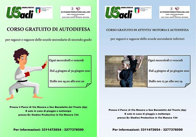 SAN BENEDETTO DEL TRONTO – Dopo il successo dell’iniziativa “Follow yourself” dello scorso anno, l’Unione Sportiva Acli Marche ed Ec Studios Production Asd Aps propongono un nuovo progetto gratuito per i ragazzi. Dal 4 giugno, infatti, prenderanno il via due corsi che si terranno presso il Parco di Via Manara e, solo in caso di pioggia o maltempo, presso la sede di Ec Studios Production Asd Aps in via Manara 134. Per i ragazzi e le ragazze delle scuole secondarie inferiori fino al 30 giugno, ogni mercoledì e venerdì dalle ore 17,30 alle ore 19, si svolgerà un corso gratuito di attività motoria ed autodifesa. Per i ragazzi e le ragazze delle scuole secondarie di secondo grado, sempre fino al 30 giugno, dalle ore 19 alle ore 20 di ogni mercoledì e venerdì si svolgerà invece un corso gratuito di autodifesa. Per informazioni ed iscrizioni alle due iniziative si può contattare la segreteria di Ec Studio Production Asd Aps ai numeri 3311472654 e 3277378590. In alternativa si possono consultare il sito www.usaclimarche.com e la pagina facebook Unione Sportiva Acli Marche.