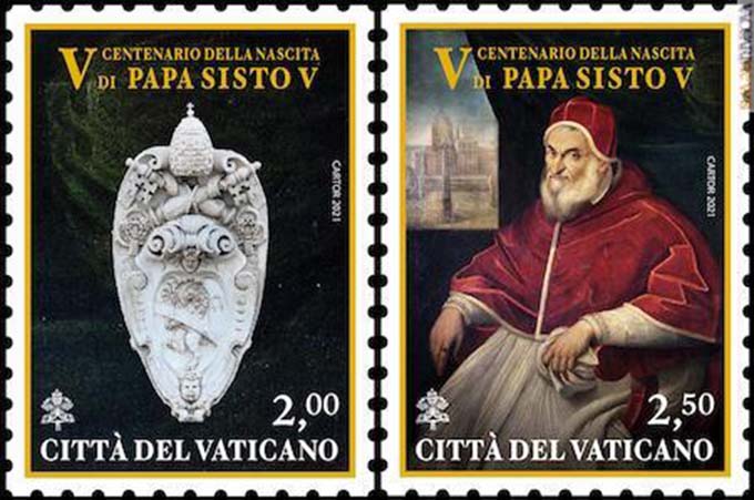 I preziosi francobolli in uscita dalla Santa Sede segnano in qualche modo una ripartenza delle Celebrazioni sistine – ferme nella prima parte dell’anno a causa della pandemia -, oltre a omaggiare un Papa che, in soli 5 anni (dal 1585 al 1590), ha agito in modo determinante e duraturo nelle Istituzioni ecclesiastiche, nella liturgia, nelle relazioni internazionali, nella riorganizzazione sociale ed economica dello Stato Pontificio, nella pianificazione urbanistica e nell’edilizia. Sisto V è ricordato con affetto e riconoscenza dalla sua terra d’origine, dove sono ancora tangibili i suoi interventi. Ma gli è riconosciuto un grandissimo valore anche al di fuori delle Marche, in particolare a Roma, il cui assetto urbanistico è stato visibilmente migliorato dal Pontefice. Solo a titolo di esempio, a Roma Sisto V fece completare la Cupola di San Pietro, demolire e ricostruire il Palazzo Laterano e, per unire simbolicamente i quattro angoli di Roma, fece erigere altrettanti obelischi: in piazza San Pietro, in piazza dell’Esquilino, in piazza San Giovanni in Laterano e in piazza del Popolo. E, solo per citare un altro tra i tanti interventi nella Capitale, fece costruire una cappella all’interno della Basilica di Santa Maria Maggiore, in cui ancora oggi riposano le sue spoglie.