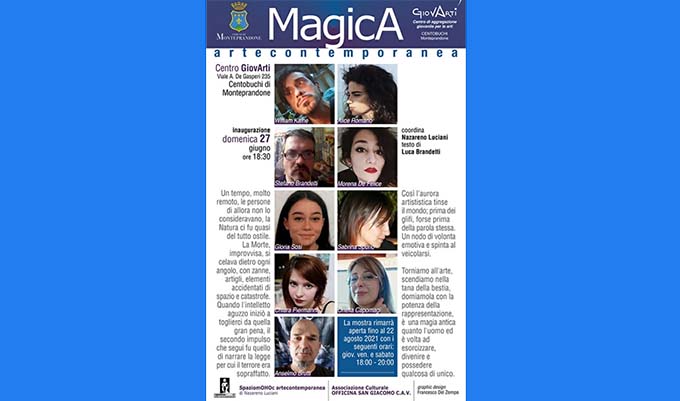MONTEPRANDONE – Con “Magica” l’arte contemporanea torna al GiovArti a Centobuchi di Monteprandone. Da domenica 27 giugno (inaugurazione alle ore 18.30), la sala esposizioni del centro giovanile per le arti tornerà ad ospitare un evento artistico unico nel suo genere. «Dopo l’inquietante periodo pandemico – spiegano gli organizzatori dell’associazione culturale Officina San Giacomo e dello SpaziomOHOc artecontemporanea di Nazareno Luciani –  sembra tornare una luce, un respiro di sollievo verso l’Arte, divenuta quasi una meteora. E allora ecco che il nostro territorio torna a respirare il profumo della creatività». Nove gli artisti invitati per questo momento culturale: Stefano Brandetti, Anselmo Brutti, Onelia Capomagi, Morena di Felice, William Kaine, Chiara Piermanni, Alice Romano, Gloria Sosi, Sabrina Spurio. «Gli artisti si impegneranno a rendere lo spazio ad una Magica vita – proseguono gli organizzatori – mentre un testo di Luca Brandetti accompagnerà l’evento espositivo. La necessità di forti azioni e gesti culturali continuano a dare emozioni al nostro territorio anche grazie all’Amministrazione comunale che è stata sempre vicino all’Arte e ai giovani. Un dialogo che si rinnova senza timori e generosità». La mostra sarà aperta dal giovedì al sabato, dalle 18 alle 20, fino al 22 agosto. L’ingresso è gratuito. Per info e prenotazioni: 328.7180203 oppure nazareno.luciani@yahoo.it.