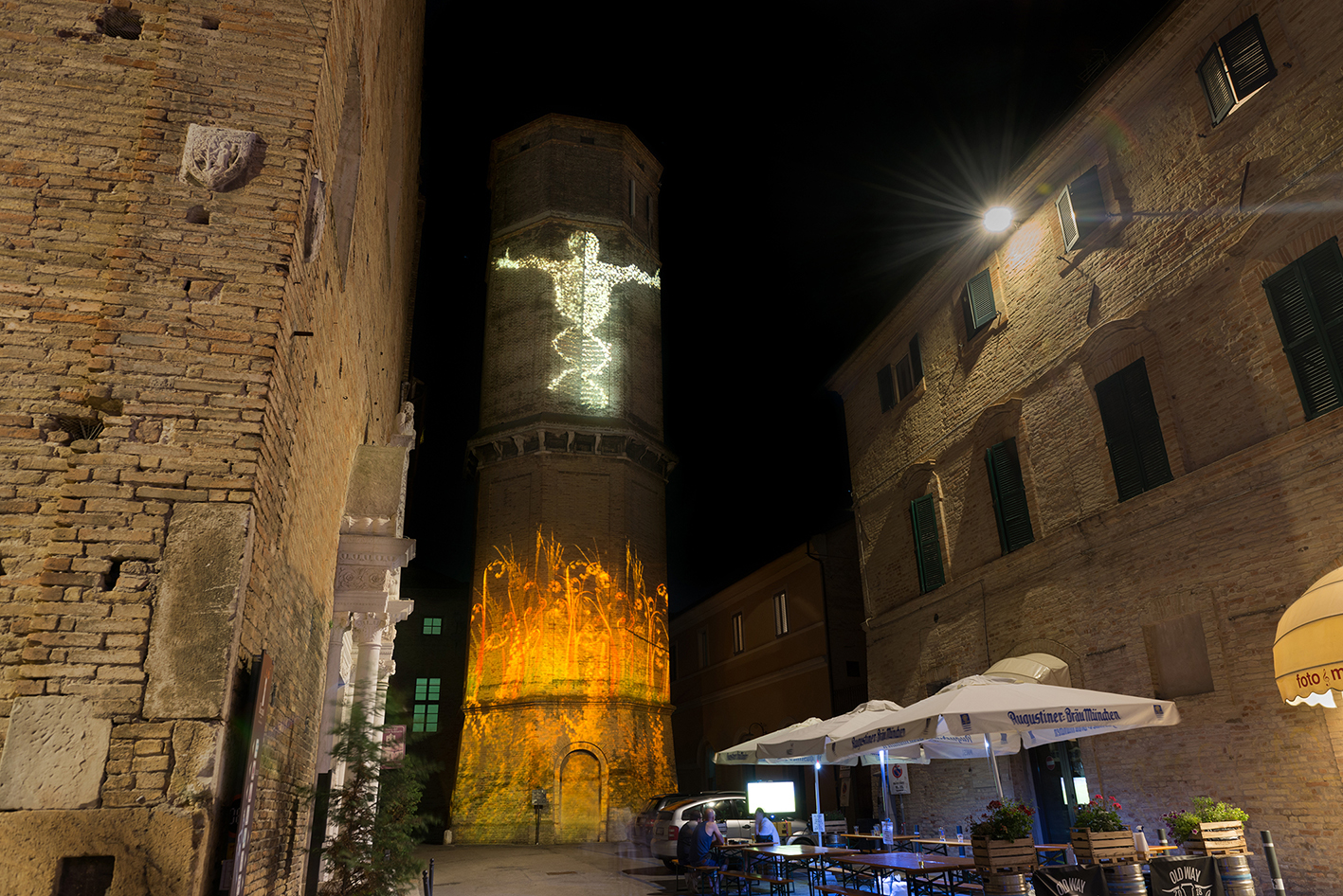 Le proiezioni sono enfatizzate dalla luce architetturale del chiostro che valorizza lo stile medievale esaltandone le volumetrie e conferendo maggiore profondità allo spazio centrale. Arrivando poi presso Piazzale Pietro Giordani, la Torre dell’Acquedotto suggella il ruolo dell’acqua come fonte di vita per l’umanità, rappresentata dalla silhouette umana stilizzata dello studio Arup, e celebra la Natura, rievocata invece dalle piante dello studio Speirs Major. Di nuovo troviamo l’invito a una maggiore coesione sociale all’interno della comunità e a rispettare l’ambiente, fonte di salute e benessere per gli ecosistemi. Si prosegue quindi all’interno del Chiostro di Palazzo Venieri, sede del Liceo “Giacomo Leopardi”, dove Giancarlo Basili propone di Light Bureau la proiezione dell’elemento acqua, centrale in tema di cambiamento climatico e strumento per mettere in guardia la collettività sulle conseguenze delleazioni umane.