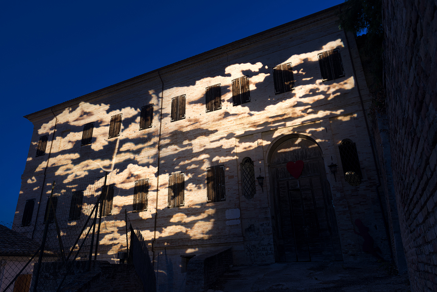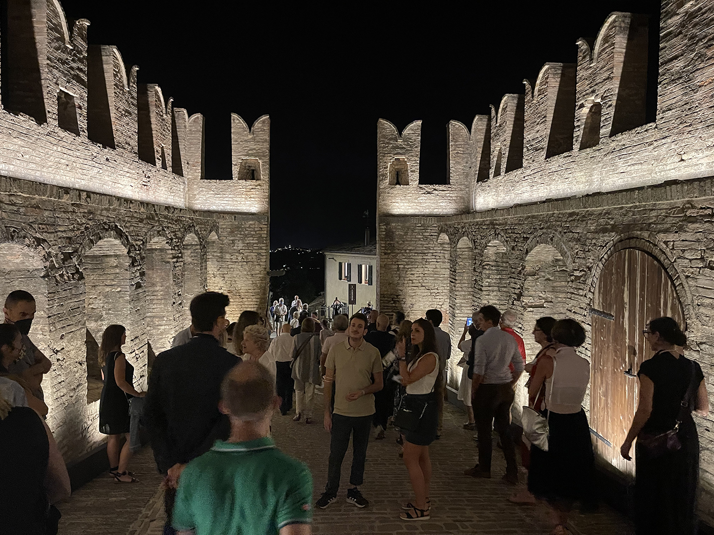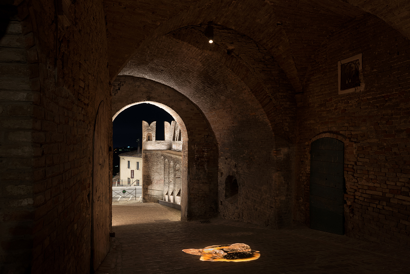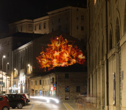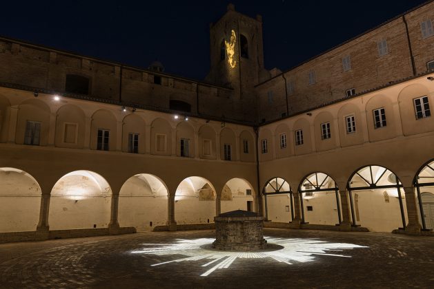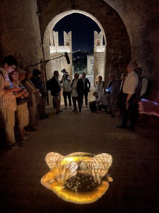 L’acqua come forza distruttrice fa quindi spazio alla forza creatrice della Natura, al grido di “Volat irreparabile tempus” dell’orologio. È un invito a scoprire l’architettura progettata da Giuliano da Maiano e godere, attraverso l’arco del balcone, di uno dei panorami più sorprendenti della Riviera Adriatica. A completare l’installazione c’è l’illuminazione architetturale del Chiostro, che ne valorizza l’architettura rinascimentale. Il rapporto Uomo/Natura e la necessità di preservare la biodiversità ricorrono nella Porta San Filippo, dove l’ape di Arup viene proiettata sull’asfalto e diventa simbolo delle specie animali e vegetali a rischio di estinzione. L’illuminazione architetturale della porta, formata da un grosso torrione con beccatelli a sporto e una cortina di difesa tagliata da una grande apertura, ne esalta i caratteri medievali valorizzando uno degli antichi ingressi al borgo.