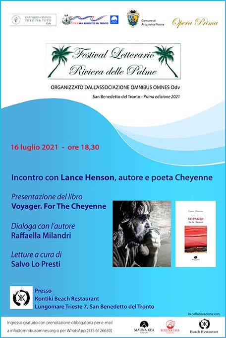 SAN BENEDETTO DEL TRONTO – Non è la prima volta che il poeta nativo americano Lance Henson, di fama internazionale, viene ospitato a San Benedetto del Tronto, e l’autore ha mostrato di apprezzare particolarmente la Riviera delle Palme. L’appuntamento è per venerdì 16 luglio alle ore 18.30 allo Chalet Kontiki, e il poeta Cheyenne, oltre a presentare il libro “Voyager. For the Cheyenne”, pubblicato dalla sambenedettese Mauna Kea Edizioni, parlerà di cultura dei Nativi Americani e degli argomenti che ultimamente hanno scosso i media internazionali, ovvero i tragici ritrovamenti di corpi di bambini nativi nei terreni di scuole missionarie canadesi, collegandosi al tema più ampio della casistica di donne e bambini nativi scomparsi, un fenomeno che permane anche ai giorni nostri. A dialogare con l’autore ci sarà Raffaella Milandri, e le letture saranno a cura di Salvo Lo Presti. É questo il terzo appuntamento nel calendario del Festival Letterario Riviera delle Palme, a cura della associazione sambenedettese Omnibus Omnes, che vedrà il 23 luglio come ospite Pietroneno Capitani. Si raccomanda la prenotazione, nel rispetto delle norme anti Covid.