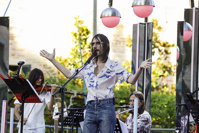 RECANATI – «Una serata magnifica è un emozione strepitosa esseri qui con voi» ha detto Francesco Bianconi rivolto al pubblico di “Lunaria” nella cornice unica dell’Orto sul Colle dell’Infinito di Recanati, luogo simbolo della poesia mondiale. Dopo il saluto del Sindaco di Recanati Antonio Bravi, Francesco Bianconi ha aperto la rassegna estiva ideata e diretta da Musicultura, promossa dal Comune di Recanati, con un doppio concerto uno al tramonto e uno la sera nella suggestiva e vibrante scenografia Leopardiana. «Con Giacomo Leopardi ho un legame molto antico, lo sento da sempre profondamente vicino alla mia sensibilità, ringrazio i miei vecchi professori per avermi fatto imparare a memoria le sue poesie» ha affermato il cantante dei Baustelle che ha offerto un emozionante live con i brani del suo primo album da solista “Forever”.