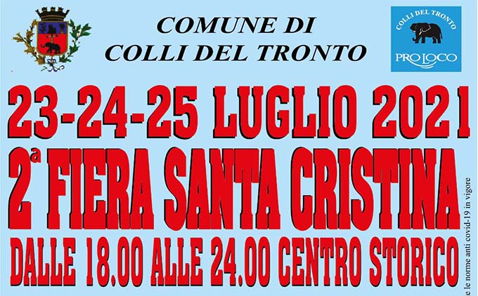 COLLI DEL TRONTO – Tutto pronto per la seconda edizione Fiera di Santa Cristina di Colli del Tronto, che si terrà dal 23 al 25 luglio. Tutti e tre i giorni dalle ore 18 a mezzanotte, al centro storico di Colli, ci saranno artigianato, antichi mestieri, hobbistica e gli stand gastronomici Per i più piccoli tanti giochi di una volta, con animazione di artisti di strada e giocolieri. La manifestazione vuole essere un modo per riscoprire le antiche fiere – proprio come quella antica di Santa Cristina che si teneva a Colli fino a oltre 50 anni fa – che mettevano in mostra le peculiarità e le eccellenze del luogo. L’evento è stato riproposto nel 2020 dall’Amministrazione Cardilli, dopo che si è provveduto al restauro della Fonte di Santa Cristina e realizzato un nuovo percorso che la collega con il centro storico di Colli capoluogo.
