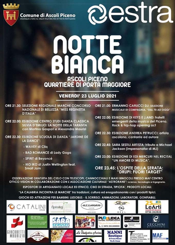 ASCOLI PICENO – L’Amministrazione Comunale ricorda che domani sera, venerdì 23 luglio, nel rispetto di tutte le normative anti Covid vigenti, si svolgerà la Notte Bianca del Quartiere di Porta Maggiore. La serata si aprirà alle ore 21 con la selezione musicale di compagnia, “Dal 70 ad oggi”, a cura di DJ Ermanno Carucci, mentre alle 21.30 si darà il via alla selezione regionale Marche con il concorso nazionale di bellezza per “Miss Reginetta d’Italia”. La serata proseguirà alle ore 22 con l’esibizione del centro studi danza classica Silvia D’Emilio intitolata “La notte della taranta”, con Martina Gaspari e Alexandra Maurizi; in contemporanea, si svolgerà anche l’esibizione di Keys e J.And, fratelli emergenti della musica e del Piceno con Rock & hip-hop. Alle 22.30 si potrà assistere all’esibizione della scuola di danza “Jardine de la dance” e ascoltare l’esibizione di Andrea Petrucci, artista cantante e autore ascolano. Si prosegue alle 22.45 con il tributo a Michael Jackson dell’artista Sara Sestili, mentre alle 23 Edi Edi Mercuri si esibirà nel recital “Un amore di musica”. Alle 23.45 il grande ospite della serata, Drupi, darà il via allo spettacolo “Fuori Target”. Nel corso dell’intera serata, i presenti potranno osservare gratuitamente il cielo stellato con telescopi, cannocchiali e maxi binocoli presso Maf Centro Ottico Vision: un progetto innovativo, in collaborazione con l’associazione culturale “Astrorane”, che unirà scienza, tecnologia e ingegneria nella splendida serata del quartiere di Porta Maggiore. La kermesse sarà infine impreziosita dalla presenza degli espositori di artigianato locale ed etnico, cibo di strada, tipicità, prodotti locali, oltre a giochi, attrazioni e laboratori per i più piccoli.