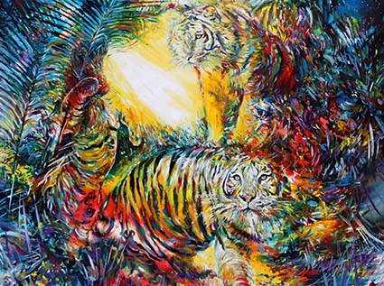 Tema prediletto: la Musa presentata e vista non come dea o come donna-oggetto, ma come Musa che ispira il genio creativo, in una sorta di simbiotico rapporto d’anime. Un idillio impastato di luci e ombre, come il grande quadro di sfondo presenta con una catena di erti monti alla base e un cielo oscuro di una notte di pioggia o come lo sguardo fiero delle tigri. La tigre in molti paesi è ritenuto un animale sacro e Mario Vespasiani la raffigura molto bene conducendo chi guarda a quella visione esoterica di William Blake, poeta e artista inglese del XVII° secolo. Questo felino “Musa” ispira e diviene l’archetipo allegorico dell’immagine di un complesso di forze “titaniche” e terrificanti ma anche creatrici. La Tigre richiama ad una forza sovrannaturale che accede all’Assoluto con connotazioni positive per la potenza, negative per la natura selvaggia e talvolta distruttrice.