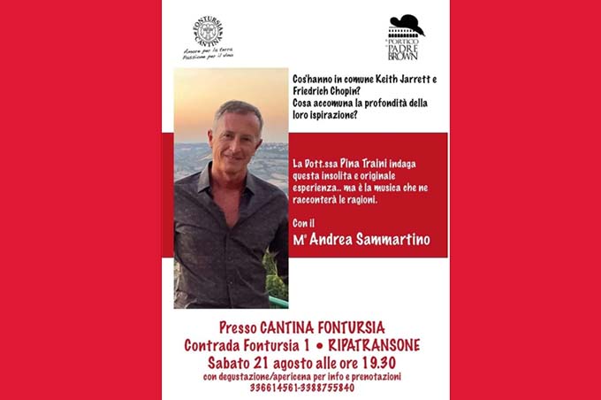 RIPATRANSONE – Questa sera, sabato 21 agosto alle ore 19.30, Concerto del grande Maestro pianista Andrea Sammartino intervistato dalla giornalista della Sala Stampa Vaticana Dott.ssa Pina Traini presso la Cantina Fontursia di Ripatransone dove si prevede una degustazione/apericena per prenotazioni 336614561- 3388755840. Andrea Sammartino appartiene alla prestigiosa scuola pianistica di Vicenzo Vitale. Si è diplomato presso il Conservatorio di Santa Cecilia di Roma con il Maestro Carlo Bruno, con il massimo dei voti. Dopo aver conseguito la laurea in lettere ha studiato con i più illustri maestri, iniziando l’attività concertistica da solo, in formazione da camera, ed orchestrale. Ha frequentato corsi di perfezionamento presso l’Accademia di Verona con il Maestro Alexander Lonquich ed a Salisburgo presso l’International Akademie der Hochschule Mozarteum con il maestro Michail Voskresenskji. Ha conseguito l’alto perfezionamento presso la Hochschule fur Musik di Colonia e presso l’Ecole Normale de Musique di Strasburgo. Ha dato concerti, riscuotendo consensi di pubblico e di critica, nelle più importanti città italiane ed all’estero e ha suonato anche alla Casa Bianca. Per avvicinare il pubblico alla grande musica, Andrea Sammartino tiene inoltre Lezioni-Concerto, in cui affianca all’esecuzione la spiegazione e l’approfondimento dei brani musicali. É docente presso il Conservatorio di Parma. Il pianista Andrea Sammartino presso la Cantina Fontursia di Ripatransone il 21/08/21 alle ore 19.30 proporrà un’interessante lezione concerto imperniato sulle figure di Frèdèric Chopin e keith Jarrett con la presentazione e l’intervento della giornalista della Sala Stampa Vaticana Dottoressa Pina Traini. È prevista una degustazione/apericena per prenotazioni 336614561 o 3388755840.