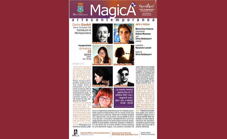 MONTEPRANDONE – Nuovo appuntamento al Centro GiovArti di Centobuchi di Monteprandone con “Magica2”, mostra d’arte contemporanea nella quale nuovi giovani eccellenti espongono le loro opere inedite. Gli artisti sono sette e sembra si siano battaglia con i loro elaborati tra pittura scultura ed installazioni. Ado Brandimarte già presente sul territorio con “A perdere” la prima opera di LandArt realizzata in travertino con la quale si conserva valore e antica memoria. Davide Curzi, giovanissimo, ha nel colore a volte senza schemi il suo mondo, i suoi sogni. La sua ricerca pittorica emoziona. Aurora Paccasassi e le sue opere dove l’arte bizantina e le maschere africane hanno un forte impatto emotivo. Maria Elisa Palermi artista giovane, musicista, pittrice videomaker riesce ad emozionare per la sua presenza originale e dinamica che insieme a Silvia Baldassarri e Andrea Mancuso proporrà una performance di musica e poesia. Sophia Ruffini giova con l’arte e stupisce lo spettatore con i suoi manufatti creati con fili inanimati vo  mix di erbe spontanee e resina acrilica. Paolo Sacchini che nella sua pittura inserisce una carica astratta che diventa racconto, presa di coscienza visionaria. L’emotività che traspare in lui diventa un insieme di segni e gesti. Barbara Torquati è un’artista che osserva il mondo attraverso la sua pittura con la quale unisce poetica e sensibilità. Osservare le sue opere ed amare le semplici cose della nostra vita. La mostra, voluta dall’Amministrazione comunale nell’ottica di valorizzare l’Arte Contemporanea, è organizzata dall’Associazione Culturale Officina San Giacomo e dallo SpaziomOHOc artecontemporanea di Nazareno Luciani. La mostra sarà aperta dal giovedì al sabato, dalle ore 18 alle ore 20, fino al 31 ottobre. L’ingresso è gratuito.